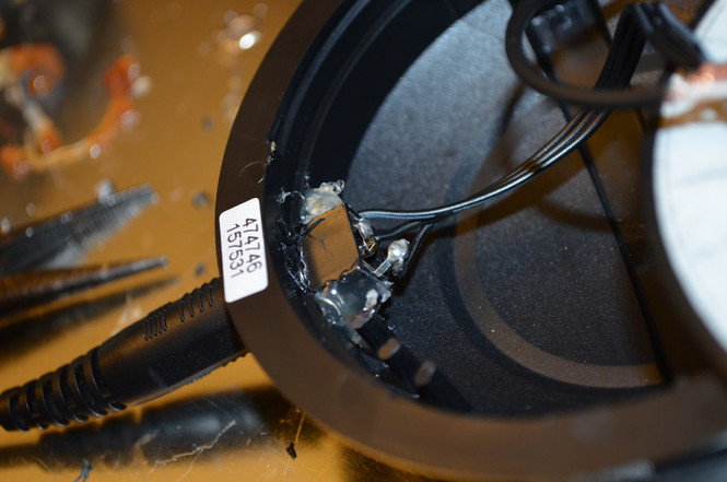 The cable hold on the earcup was too small for the 3.5mm jack to fit through, so I enlarged it slightly. By melting it away with my soldering iron. That was not best-practice but it worked…