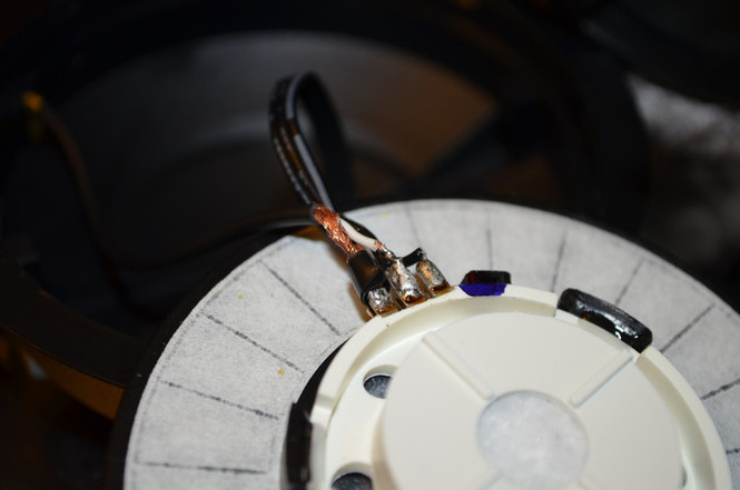 The first thing I did was remove the left driver (Or, the side with the cable going in). Then I de-soldered all of the cables connected to the driver, and removed the original cable from the earcup.