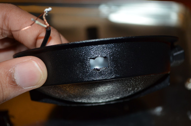 I aligned the 3.5mm jack with the hole and affixed it with a hot-glue gun. This particular jack came with a nut that threads on to it from the outside, which helps hold it in place more than the glue. You can see it in the second-to-last picture.