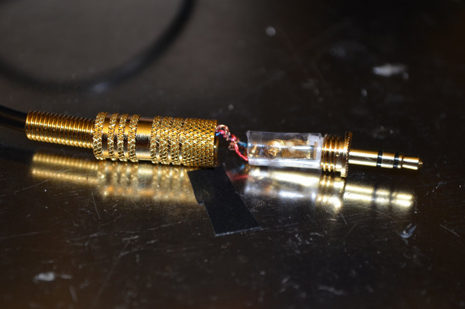 The plug I used here made the wire poke my shoulder while wearing the headphones because it was too big. I later swapped it out for a smaller REAN connector.
