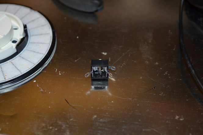 I aligned the 3.5mm jack with the hole and affixed it with a hot-glue gun. This particular jack came with a nut that threads on to it from the outside, which helps hold it in place more than the glue. You can see it in the second-to-last picture.