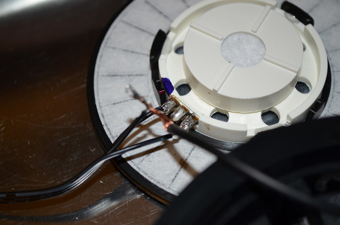 The first thing I did was remove the left driver (Or, the side with the cable going in). Then I de-soldered all of the cables connected to the driver, and removed the original cable from the earcup.