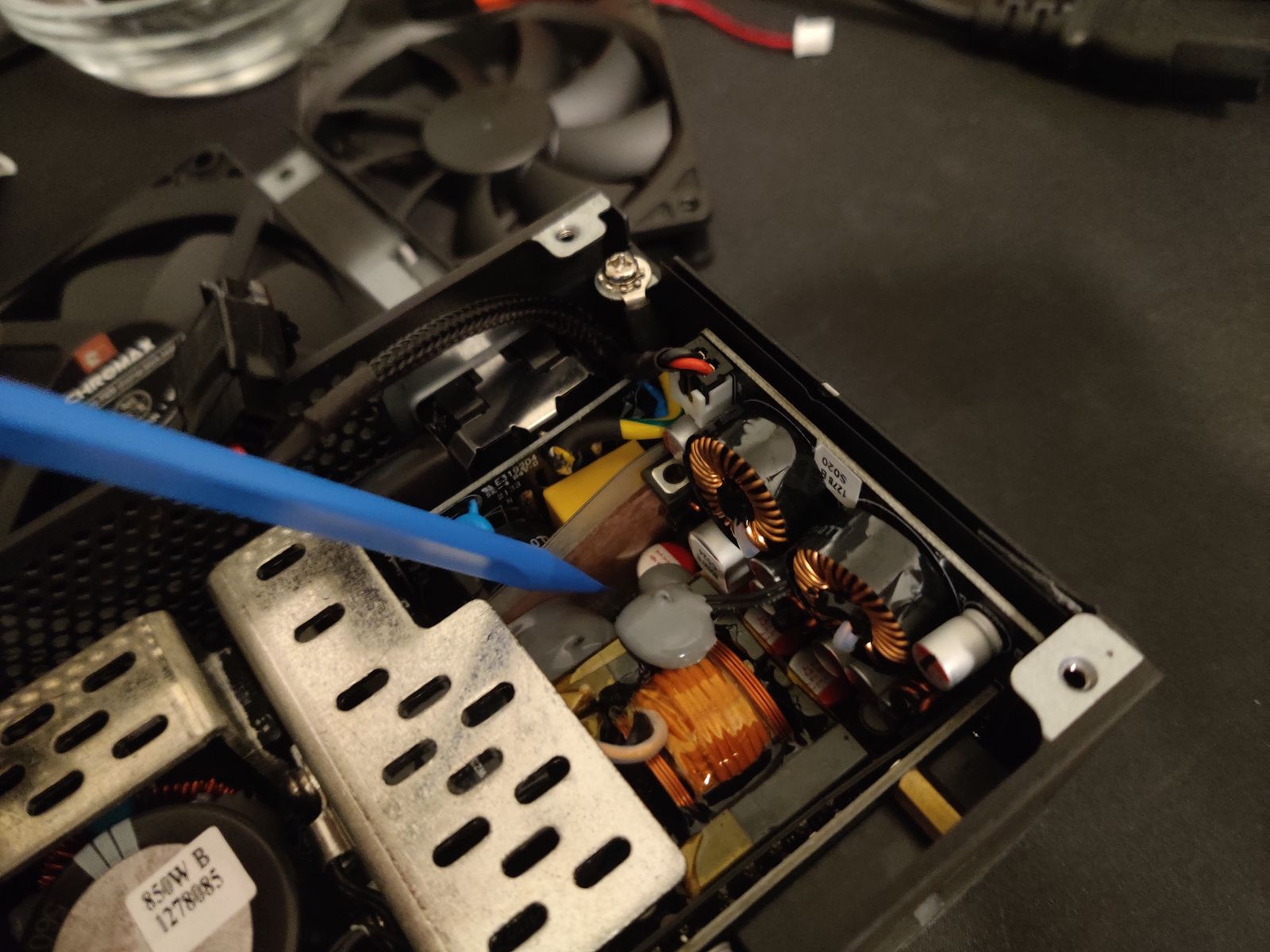 The V850 SFX is very dense and there’s not much extra space inside. In order to plug the 4-pin PWM noctua fan to the PSU, I had to use the 2-pin to 4 pin adapter. The connector for this adapter is somewhat bulky, and I had to find a space for it inside the PSU. Luckily, there is this small void right next to the fan header which can fit the connector on the adapter cable.