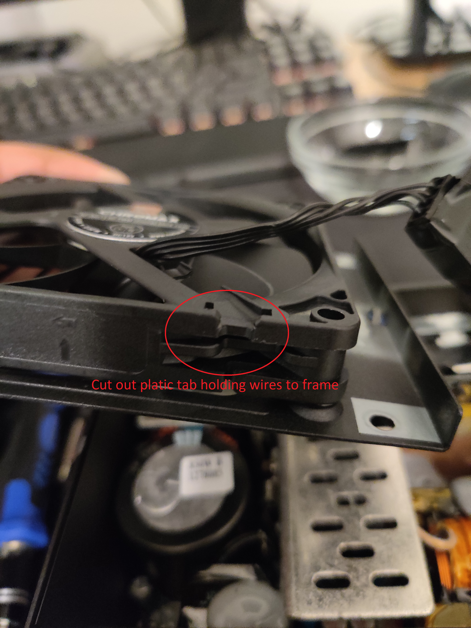By default, the noctua fan’s cable is attached to the outside of the fan’s frame by a small plastic tab. This made it impossible to position the connector inside the PSU’s empty space. I cut out this tab on the edge to free the cable and get a bit more maneuverability for the cable.