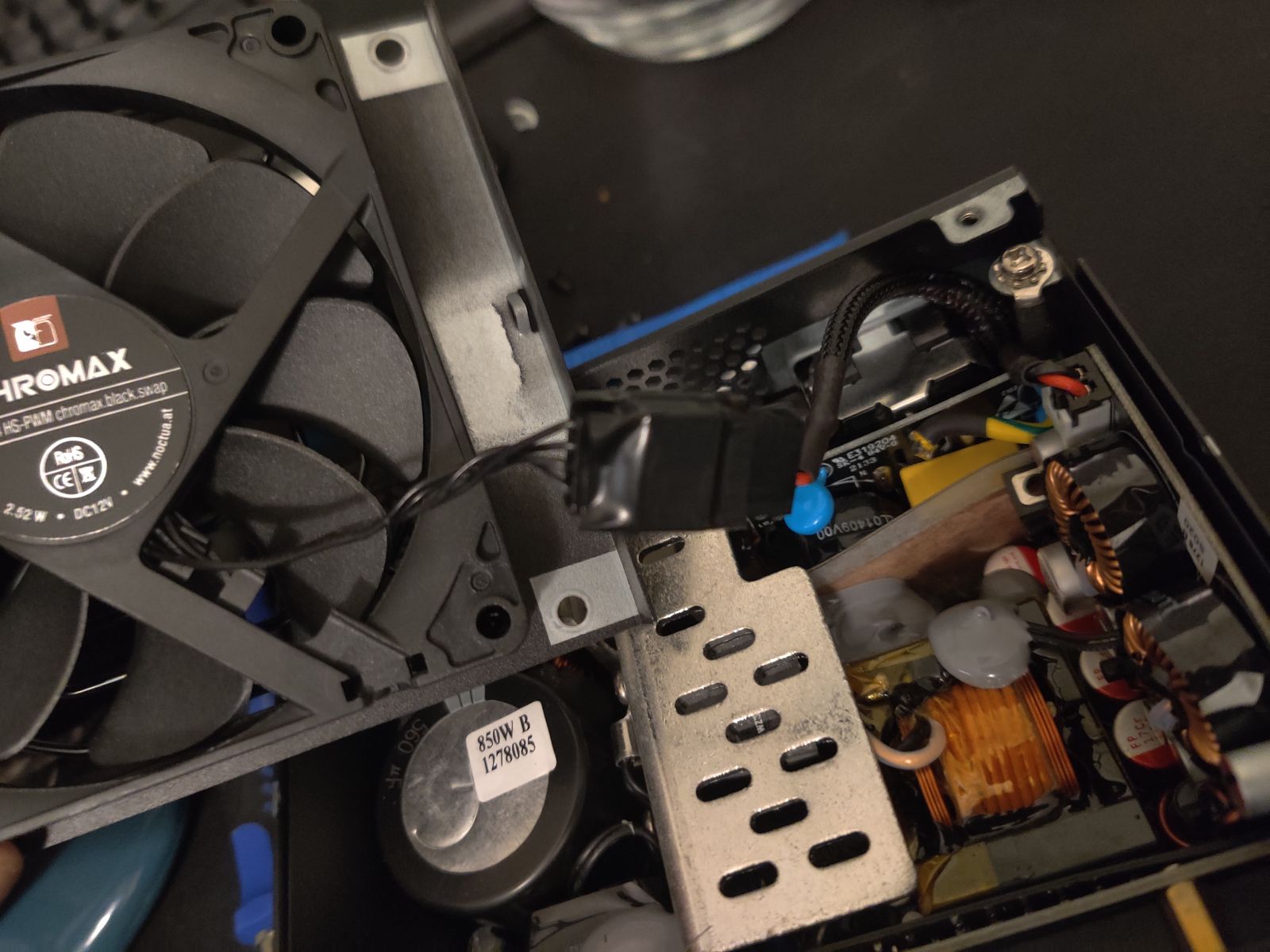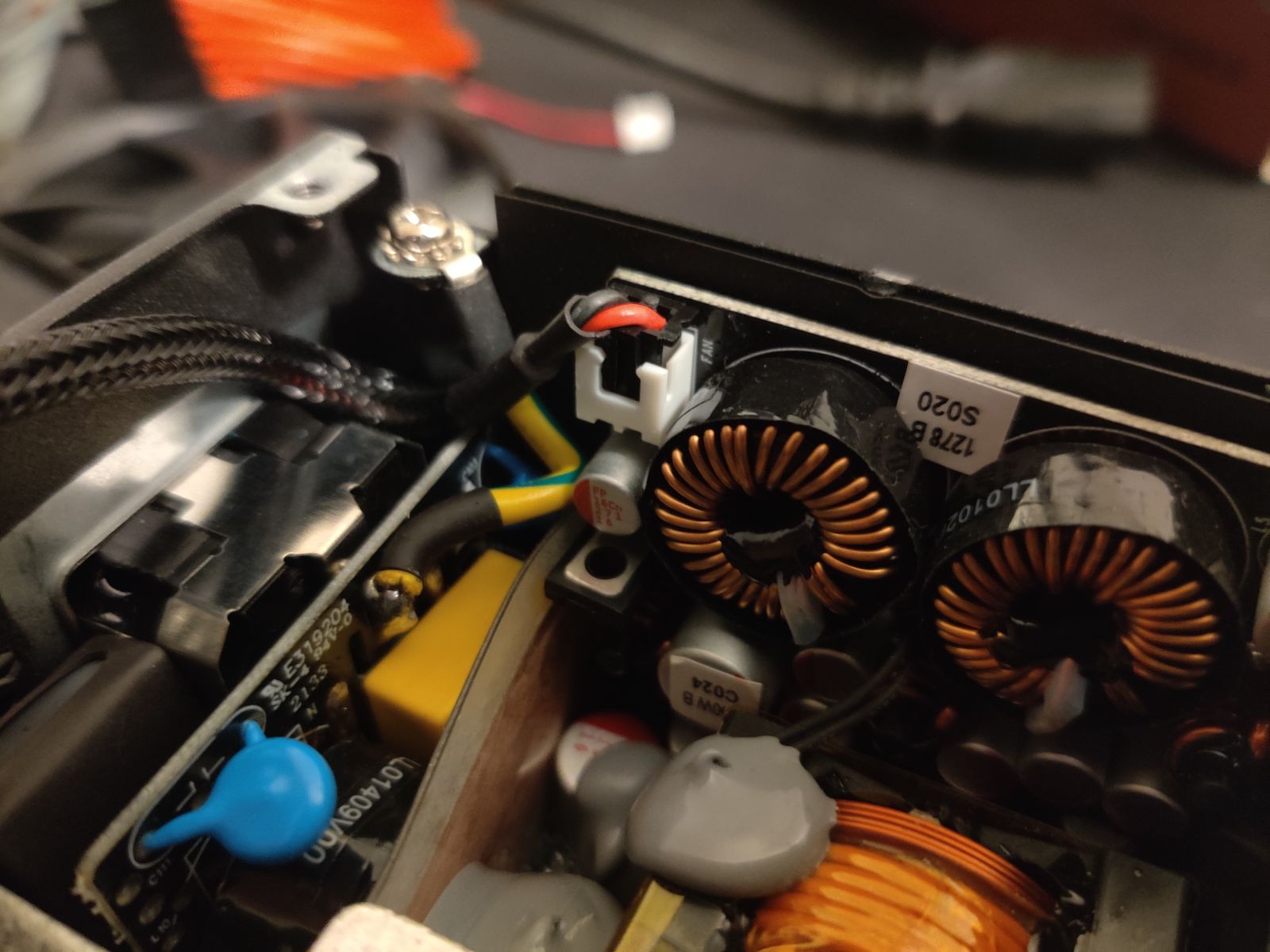 First I unscrewed the top of the PSU and unplugged the original fan. This is a picture of the 2-pin fan connector.